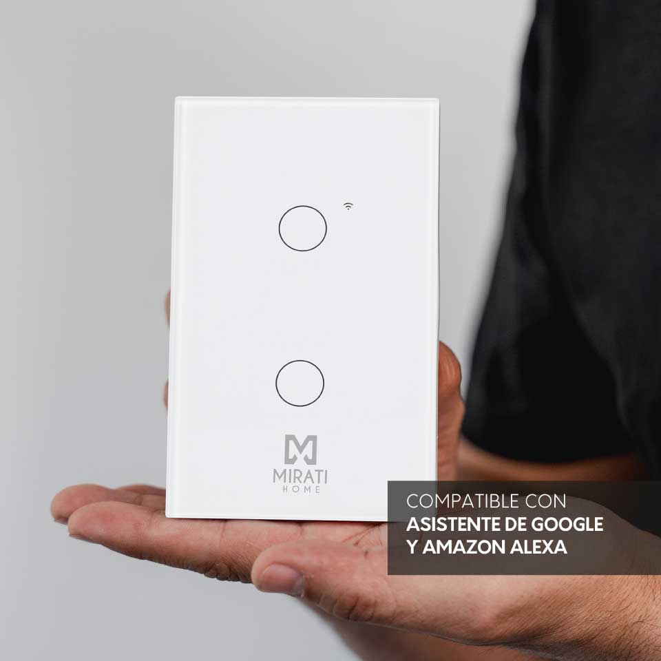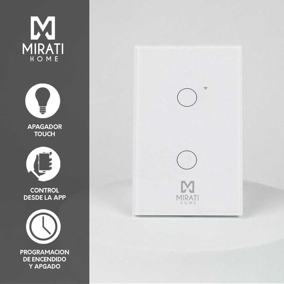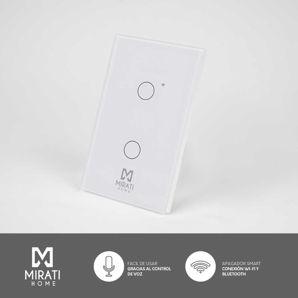 APAGADOR INTELIGENTE DE PARED MIRATI DE 2 APAGADORES TOUCH WIFI 2.4HZ BLUETOOTH // COMPATIBLE CON ANDROID E IOS // FUNCIONA CON ALEXA Y ASISTENTE DE GOOGLE